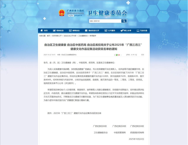 近日,广西壮族自治区卫生健康委员会办公室正式公布 2025年“广西三月三”健康文化作品征集活动获奖名单。我院在此次活动中斩获颇丰,共有17件作品获奖,其中视频类作品荣获一等奖1项、二等奖2项、三等奖4项、优秀奖7项,图文类作品斩获一等奖1项、二等奖1项、三等奖1项。